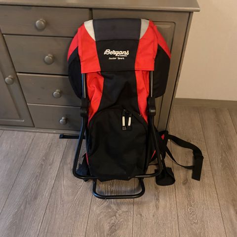 Bergans barnestol ryggsekk i rød og svart farge. Designet for å bære barn komfortabelt på ryggen under utendørsaktiviteter. Utstyrt med justerbare stropper og støtteben for stabilitet. Laget av slitesterkt materiale for bruk i variert terreng.