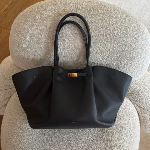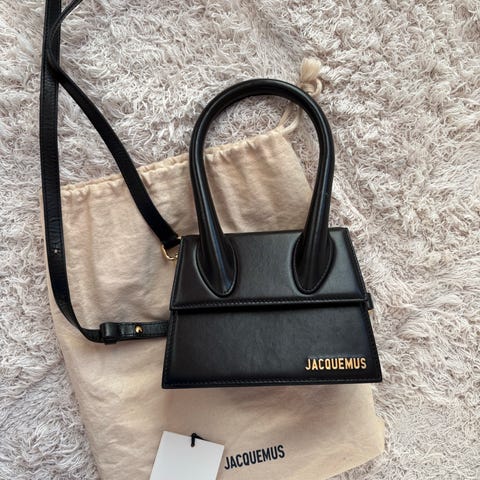 Jacquemus skinnveske til dame i svart skinn. Vesken har strukturert skinn, to korte håndtak og en avtakbar/justerbar skulderrem slik at den kan bæres både i hånden og over skulderen. Klassisk, avrundet form med knutedetalj på det ene håndtaket. Passer til hverdagsbruk og mer formelle anledninger, med plass til nødvendigheter som mobiltelefon, lommebok og småting. Nypris 990 €. Har ingen feil. Ser ut som ny 10/10.