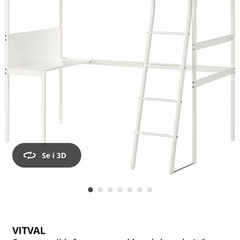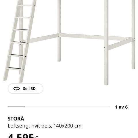 IKEA loftseng i hvit utførelse. Sengen har stige på siden og høye ben som gir god plass under sengen til oppbevaring, skrivepult eller lekeområde. Passer til standard madrass for enkeltseng (ikke inkludert). Egnet for barnerom eller rom der man ønsker å utnytte gulvplassen under sengen.