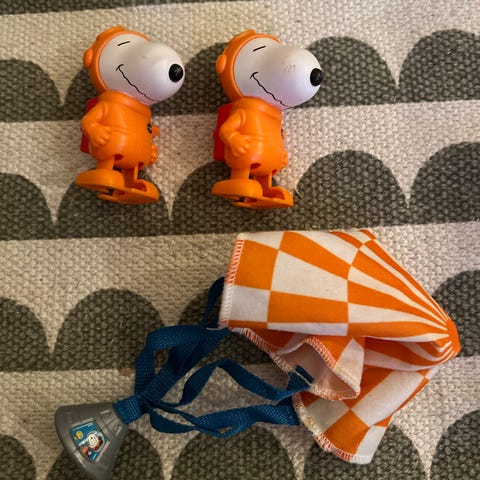 Snoopy figur som fisker, laget som en liten plastfigur. Figuren forestiller Snoopy med blå hatt, rød overdel, svarte støvler og fiskestang med fisk. Egner seg som samleobjekt, pynt eller leke for eldre barn og samlere. Størrelse er liten og passer på hylle, skrivebord eller i en samling av figurer.