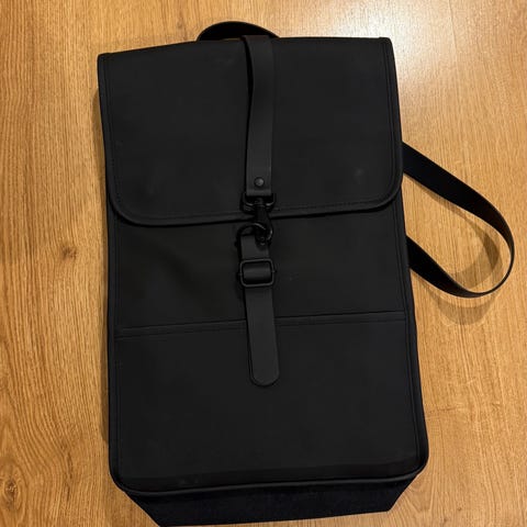 Rains ryggsekk i kunstlær for unisex. Sekken har rektangulær fasong med klaff og stroppelukking i front kombinert med magnetknapper. Hovedrommet er romslig med innvendige lommer, blant annet en polstret lomme som egner seg for nettbrett eller liten PC, samt en glidelåslomme til mindre eiendeler. Baksiden er i tekstilmateriale for bedre komfort mot ryggen, og skulderremmene er justerbare. Farge: blå