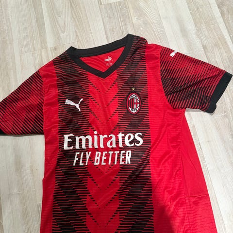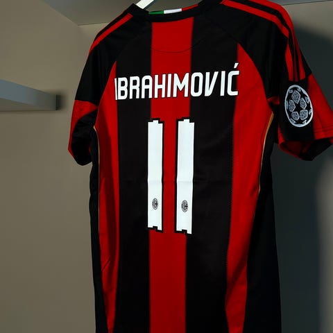 Puma AC Milan fotballdrakt med Ibrahimović og nummer 11 på ryggen. Drakten er i svart med røde vertikale striper og detaljer i grønn, hvit og rød på ermene. Serie A-merket på ermet. Fronten har klubbmerke til AC Milan og sponsorlogo. Kortermet modell i lett, pustende stoff egnet til fotballspill og fritidsbruk.