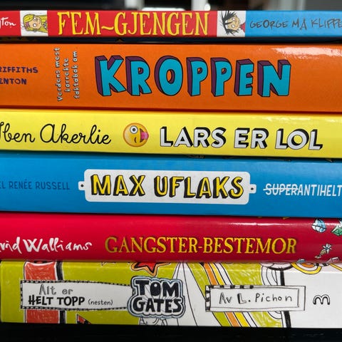 Pakke med 6 barnebøker fra ulike forfattere. Bøkene har stive permer og er i hovedsak på norsk, med én bok på engelsk. Innholdet består av historier med både tekst og illustrasjoner, noen med tegneseriepreg og andre med tradisjonelle strektegninger. Bøkene egner seg for barn som leser selv eller til høytlesning. Pakken gir variasjon i sjanger og uttrykk, fra humoristiske fortellinger til mer teksttunge historier.