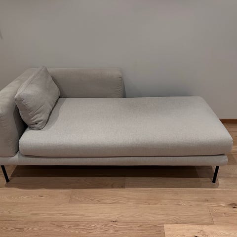 Modulsofa, lett å sette sammen. Også er det en puff som også fungerer som sjeselong.