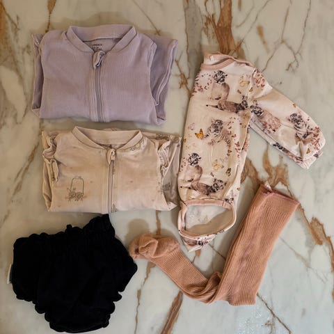 Babyklær for jente i størrelse 62. Pakken inneholder flere plagg i ulike farger og mønstre, blant annet heldresser, bodyer og bukser. Inneholder 3 ullplagg. Klær fra- name it, hust and claire, h&m & kappahl.