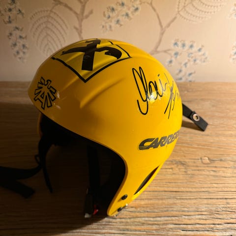 Flere signaturer på utsiden av hjelmen av blant annet Henrik Kristoffersen og Aksel Lund Svindal.