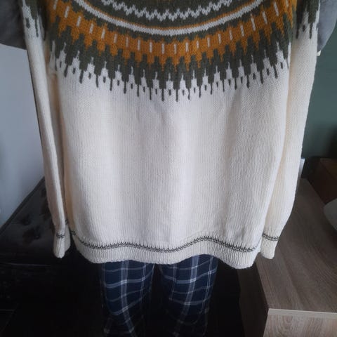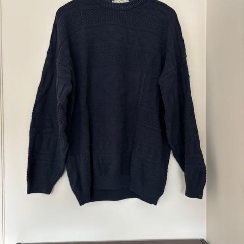Ny, håndstrikket genser i sort merinoull, superwash, str XL. Genseren er veldig myk og tøyelig i garnet, veldig behagelig på. Lengde 68 cm, overvidde 120 cm, ermlengde fra hals til håndledd, 80 cm. Ikke røyk/dyr.