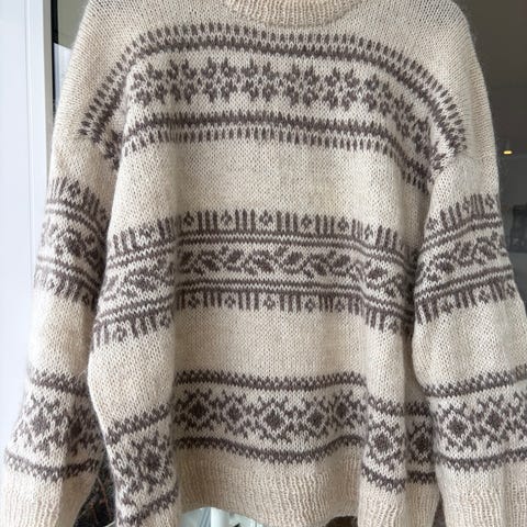Selger min Regnduft genser i str L. Om du liker en litt oversized genser kan denne også passe godt til M (på siste bilde ser du meg i genseren, og jeg er størrelse M). Genseren er myk og god, og sitter veldig fint på. Den er strikket i garnet DSA Sterk og består av 40% alpakka, 40% merinoull og 20% nylon. Garnet kostet 850 kr da jeg kjøpet garnpakken.