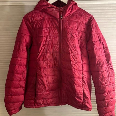 Selger en tynn boblejakke. Fargen er knallrød, litt mot den oransje siden, med turkise detaljer.