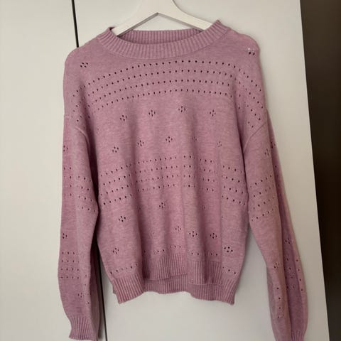 Brukt, men fin. Str. L. Farge rød. 55% lammeull, 30% angora og 15% nylon.