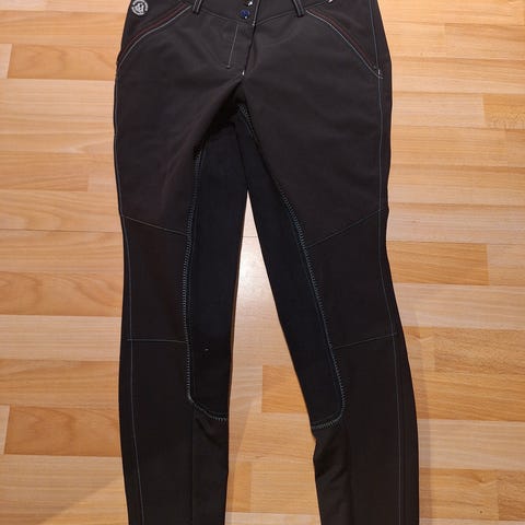 Mountain Horse ridebukse i størrelse EU 40 (UK 28). Buksa er i mørk blå farge med kontrastsømmer og helforsterket sete og kneparti. Den har glidelåslomme foran med brodert tekst og motiv.