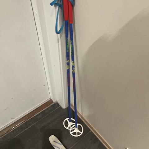 Skistaver for barn i hvit og gul farge. Stavene har håndtak med stropp og runde trinser nederst. Egnet til bruk sammen med langrennsski for barn på tur og lek i snøen.