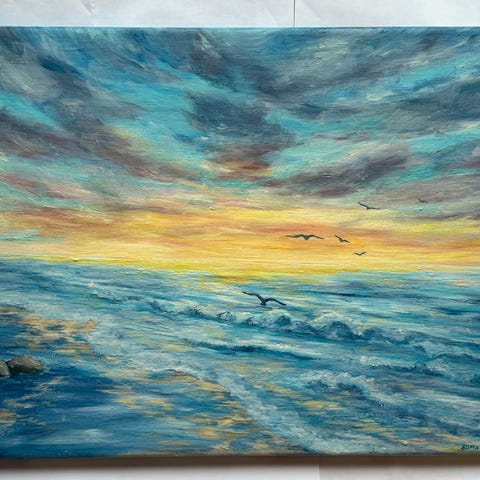 Selger originalt akrylmaleri malt på lerret (50 x 60 cm, 2 cm dybde). Det er et originalt verk, malt med akryl på lerret.