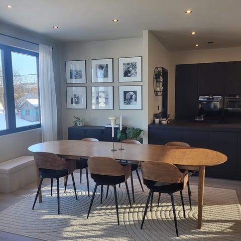 Spesialbestilt betongbord. Har også en helt lik del til som er 85cm bredt i samme dybde og høyde så man kan skjøte bordet. Vi har til hverdags benyttet den delen som pult, og satt det inntil bordet ved mange gjester. Kan kjøpes mot et tillegg på 2000kr