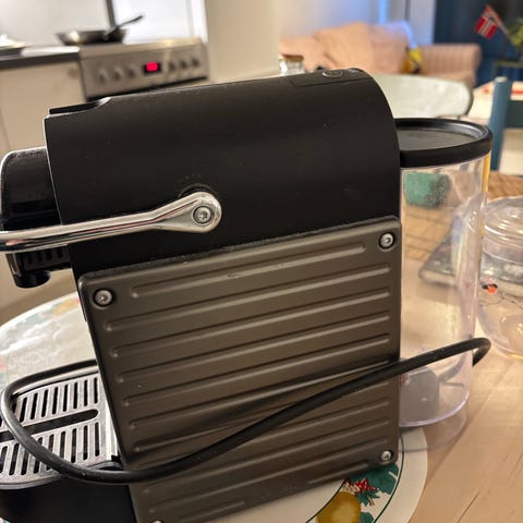 Nespresso Pixie kapsel kaffemaskin i svart med metallpaneler på sidene. Maskinen bruker Nespresso-kapsler og har avtagbart dryppbrett for ulike koppestørrelser. Egnet for tilberedning av espresso og andre kaffedrikker basert på Nespresso-systemet. Strømkabel bak på enheten for tilkobling til vanlig stikkontakt.
