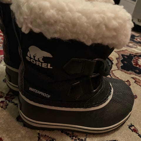 Vintersko for barn i størrelse 25. Skoene har høy skaft med stramming øverst og justerbar borrelås over vristen. Kraftig, formstøpt yttersåle i gummi og overdel i tekstil/syntetisk materiale.
