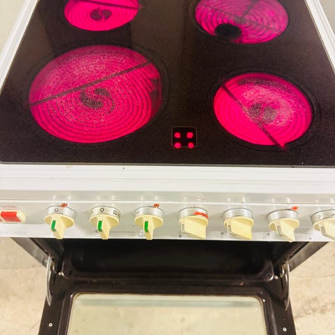 Komfyr med stekeovn og koketopp. Sto i leiligheten da jeg kjøpte den, ikke brukt av meg, og kjenner til lite nærmere informasjon. Testet og den fungerer såvidt meg bekjent.