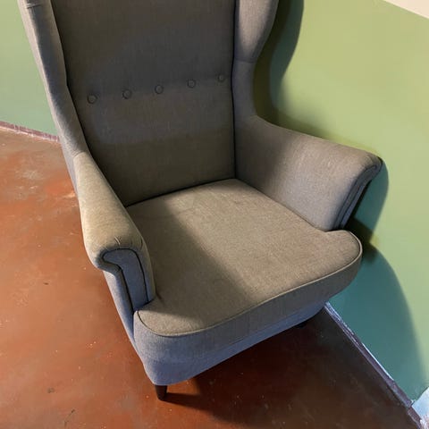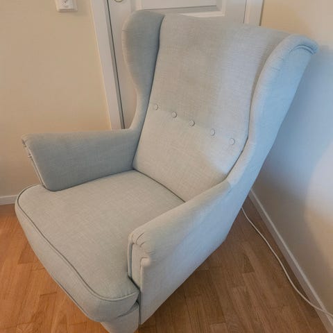 Selger en svært pen IKEA ørelappstol i lys blå tekstil.