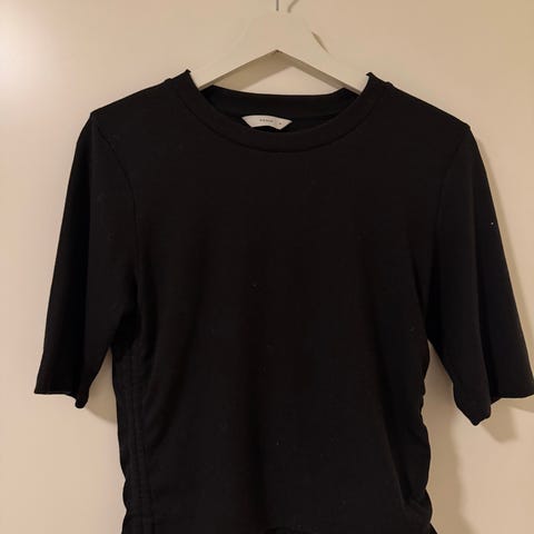 Stilig H&M topp for dame i størrelse S. T-skjorten er svart og laget av 100 % bomull. Modellen har korte ermer og snøredetaljer med maljer i sidene, som kan justeres for ønsket passform. Passer til hverdagsbruk og kan kombineres med både bukser, skjørt og shorts. Vaskes etter anvisning på care-lappen.