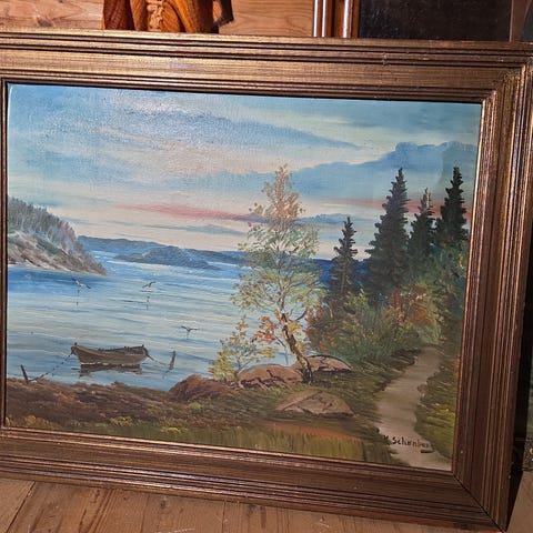 Bjørk maleri vinterlandskap med hytte og båt i dekorativ gullfarget ramme.