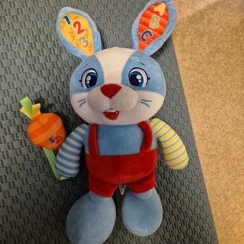 Den har flotte farger på knappene foran på magen,og har blitt lite brukt. BOINNGG lyder og musikk når man trykker på disse knappene. Lokket inni mangler men det er ikke synlig når ryggen er lukket igjen.