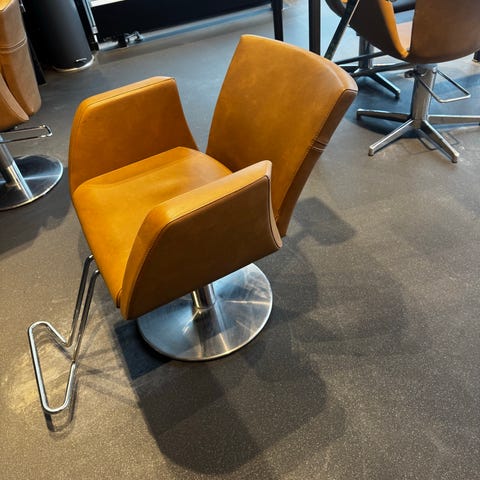2 frisørstoler fra Karisma i congac skai selges for 3000 pr stk. Stolene er pent brukt men kan ha noen svakt synlige fargeflekker.