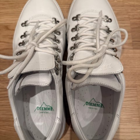 Diemme sneakers/joggesko i størrelse 40. Modellen er lave sko med snøring og metallhemper. Flerfarget i nyanser av brun og grå. Overdel i semsket og glatt materiale (syntetisk eller lærblanding er ikke spesifisert). Yttersåle i gummi med Diemme-logo under. Passer til hverdagsbruk og fritid. Kjøper bør vurdere slitasje ut fra bildene.