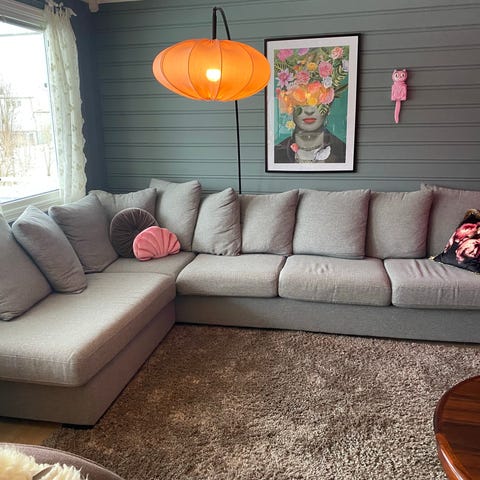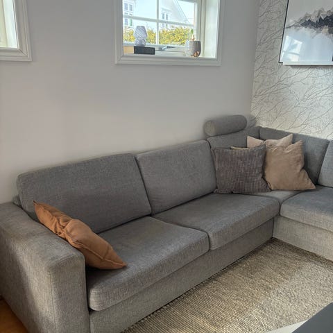 Vises her som 3 seter. Jeg har alle modulen til hjørne sofa med «sjeselong» del. Sofaen er brukt og det har vært hund i huset. Vaskbare trekk. Kjøpt på Bohus en gang i tiden.