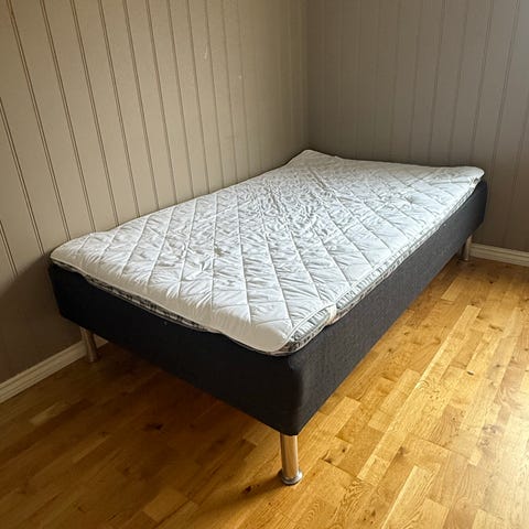 Pent brukt IKEA SKOTTERUD rammemadrass med overmadrass, fast/Tussöy 120x200 cm med bein i eik. Skuff i typen IKEA SONGESAND 139x67 cm følger med. Må hentes. Kjøpt ny i august 2024.