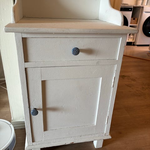 Nattbord selges da eier har vokst fra det. Trenger reparasjon av et ben i bakkant (se bilde) og ellers et malingstrøk eller to. Har stått lagret en stund og bærer noe preg av det, men kan bli et flott nattbord igjen for en ny eier med litt egeninnsats.