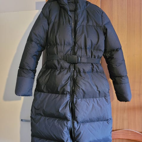 Eksklusiv S Max Mara The Cube lang dunjakke i mørkeblå, italiensk størrelse 40. Med belte i livet og avtakbar pelskant på hetten.