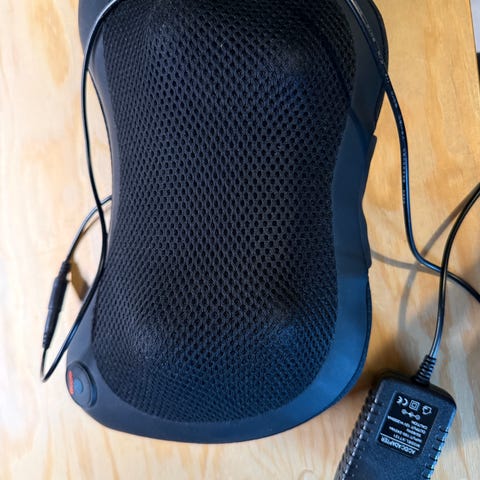 Rehbandt nakkemassasjepute elektrisk i svart farge. Massasjeputen er formet for bruk rundt nakke og skuldre, og har integrert kontrollpanel med flere funksjonsknapper for blant annet av/på, programvalg, intensitetsnivå og varmefunksjon. Yttermaterialet er en kombinasjon av glatt og perforert tekstil/kunstskinn. Produktet drives med ledning til strømuttak og er egnet til bruk hjemme for punktmassasje av nakke- og skulderområde.