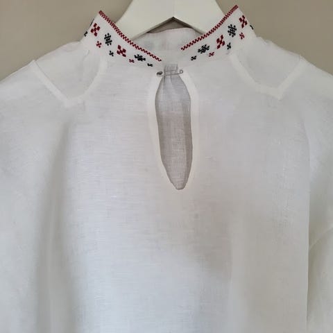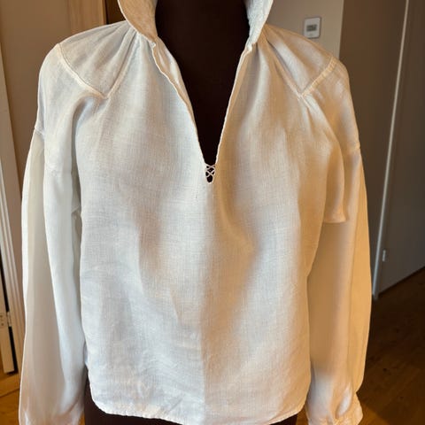 (ein liten flekk midt på skjorta framme - som blir skjult av bunaden når den er på - går muligens vekk i vask og) Derfor selges den billig .
