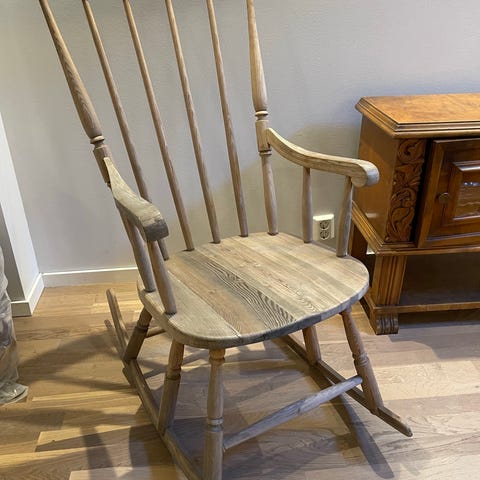 Eldre gyngestol i solid heltre, over 100 år gammel stol. Den er ikke perfekt, men har sin sjarm. God å sitte i, spesielt hvis man får slengt på saueskinn :)