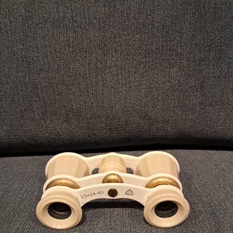 Kikkerten fremstår i vintage stand, foruten at det ene glasset er løst.