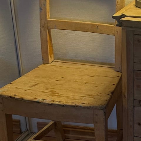 Antikke trestoler i rødmalt tre. Klassisk utforming med enkel rygg og dreide bein. Sete og overflate viser bruksspor og slitasje i malingen. Har tidligere vært malt i grønnfarge som kan synes ved avskalling av rødfargen. Passer som sittemøbler eller som dekorative stoler i for eksempel kjøkken, gang eller stue.