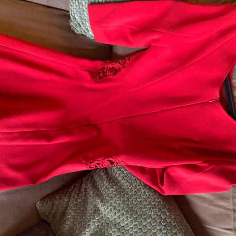 Nydelig kjole fra 60/70 tallet i rød med prikker. Denne er sydd av min mor som var sy dame. Den er en ekte vintage kjole. Stoffet er akryl typisk årstalls riktig. Kjolen har lommer, spensel i rygg og lekker krage. Kneppes med knapper.
