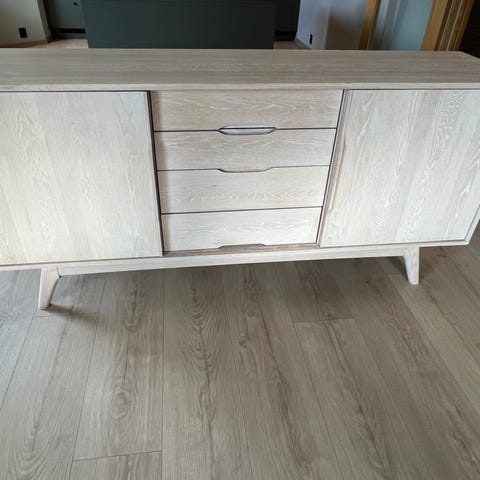 Skjenken har noen mindre sår i overflaten, og håndtak til en av skuffene har falt av, men håndtaket er tilgjengelig og kan settes på med egnet utstyr.