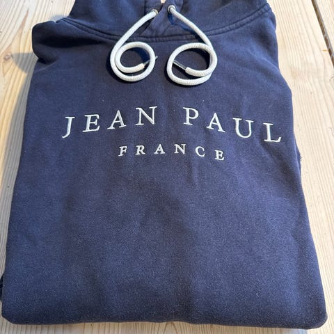 Selger en hettegenser i fargene rød, grå og mørkeblå.