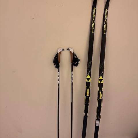 Fischer langrennsski med integrert fell i sålen. Skiene har svart overflate med markerte gule Fischer-logoer på oversiden. Undersiden har integrerte feller som gir feste ved klassisk langrenn uten behov for smøring. Egner seg til tur- og treningsbruk i preparerte løyper.