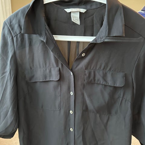 H&M skjorter for dame i brun farge, størrelse S. Skjorten er laget av bomull og har klassisk krage, knappelukking foran og brystlomme. Passer til hverdagsbruk eller som et lag over topp eller t‑skjorte.