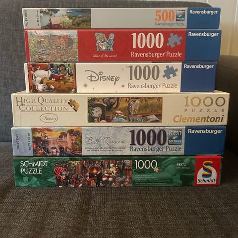 Selger flere pent brukte puslespill. 70kr per stk for Ravensburger, Clementoni og Wasgij, 50kr for de resterende. Puslespillet fra Søstrene Grene og "Scandinavian Places" fra Ravensburger mangler 1 brikke, selges derfor for 30kr per stk.