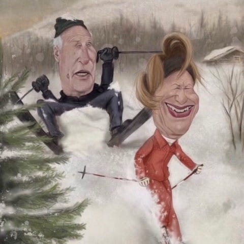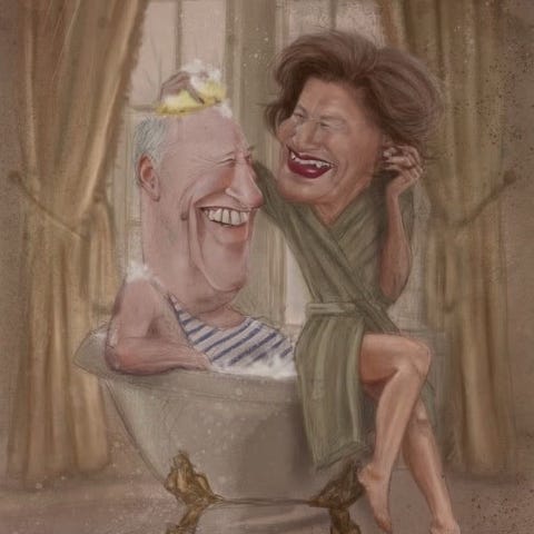 Karikaturtegning av Dronning Sonja som gir sin Konge en god skrubb i badekaret 😁🧽