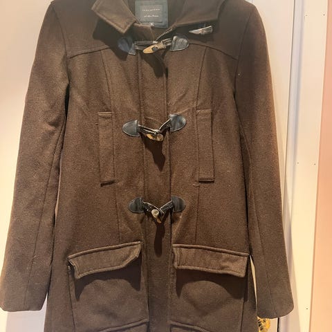 Duffelkåpe i ull (75%) fra Massimo Dutti. Grønn-brun ull brune skinnknapper. Knapt brukt. Nypris 2-3k.