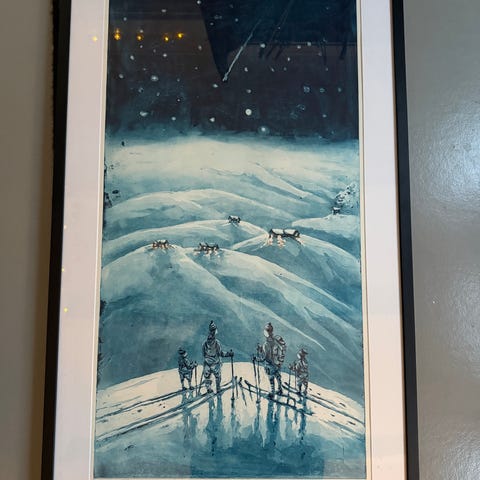 Bilde med maritimt motiv som viser to båter på sjøen foran fjellformasjoner. Fargene går hovedsakelig i blåtoner med innslag av rosa og beige. Bildet er innrammet med passepartout og enkel, mørk ramme. Egner seg som veggdekor i stue, gang eller andre oppholdsrom.