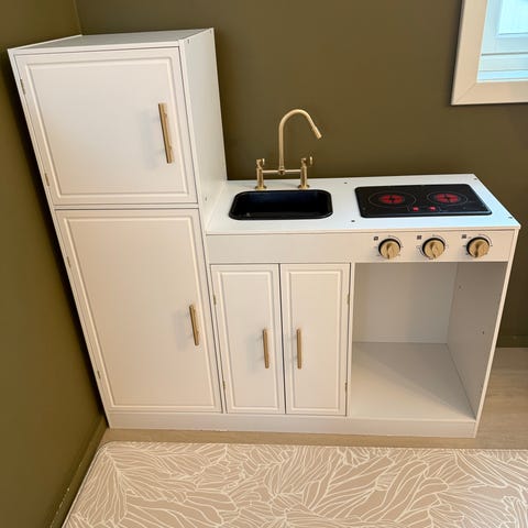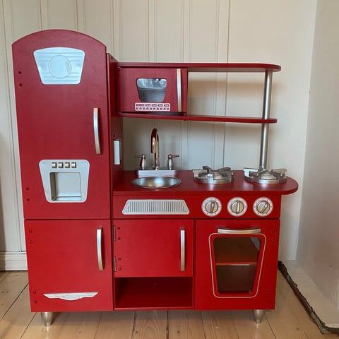 Jollyroom lekekjøkken i hvit utførelse. Kjøkkenet har kjøleskap, komfyr med kokeplater, stekeovn, vask med kran, mikrobølgeovn og åpne hyller for oppbevaring av lekemat og kjøkkenutstyr. Passer til innendørs lek for barn som liker rollelek på kjøkkenet.