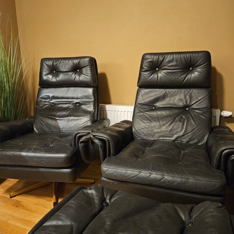 Selger to godt brukte Siestastoler med høy rygg og skammel i brunt skinn. Selges samlet for kr. 4.800.