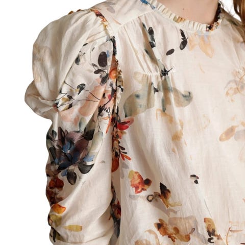 Second Female Lyna bluse i flerfarget mønster. Blusen har rund hals med knappestolpe foran og dekorative volanger på skuldrene. Modellen har lange ermer med mansjetter. Størrelse L.Passer som en lett og feminin overdel til hverdagsbruk eller mer pyntede anledninger.