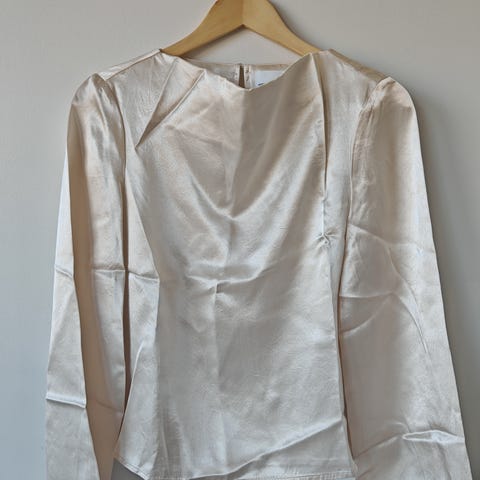 H&M bluse for dame i størrelse M. Blusen er lys Beigi og laget i polyester. Den har lange ermer med bred mansjett og lett blank overflate som gir et satengaktig uttrykk. Modellen har rund hals med enkel lukking bak i nakken og rett passform. Passer til både hverdags- og penere antrekk, og kan kombineres med bukser eller skjørt.