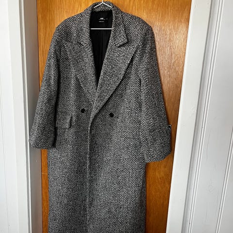 Mango Suit kåpe for dame i størrelse XXS. Kåpen er grå. Den har klassisk krage, dobbeltspent lukking og klaffelommer foran. Innsiden har rutete fôr. Lengden går nedover låret, og passformen er rett.